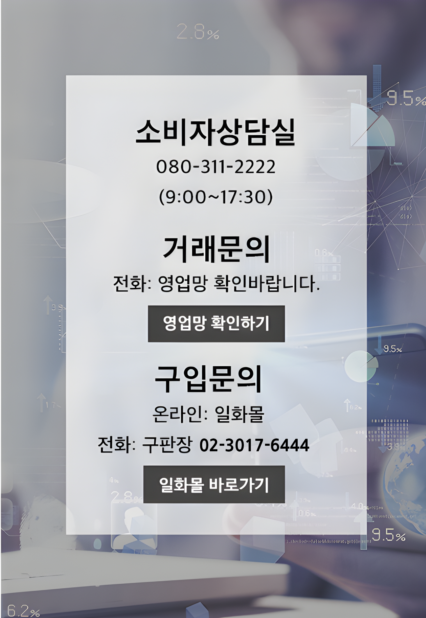 전화접수 | 수신자 부담 전화 : 080-311-2222 • 운영시간 : 평일 09:00 - 17:30 • 휴무일 : 토/일요일, 공휴일, 창립기념일(매년 12월16일), 하계단체 휴가기간, 임시휴무일(비정기) • 통화내용은 녹음되며 원활한 업무처리를 위해 연락처, 주소 등을 확인하며 서비스 목적 외에는 사용되지 않습니다. • 운영시간 외 불만 접수시 홈페이지 접수를 이용해주시기 바랍니다. |